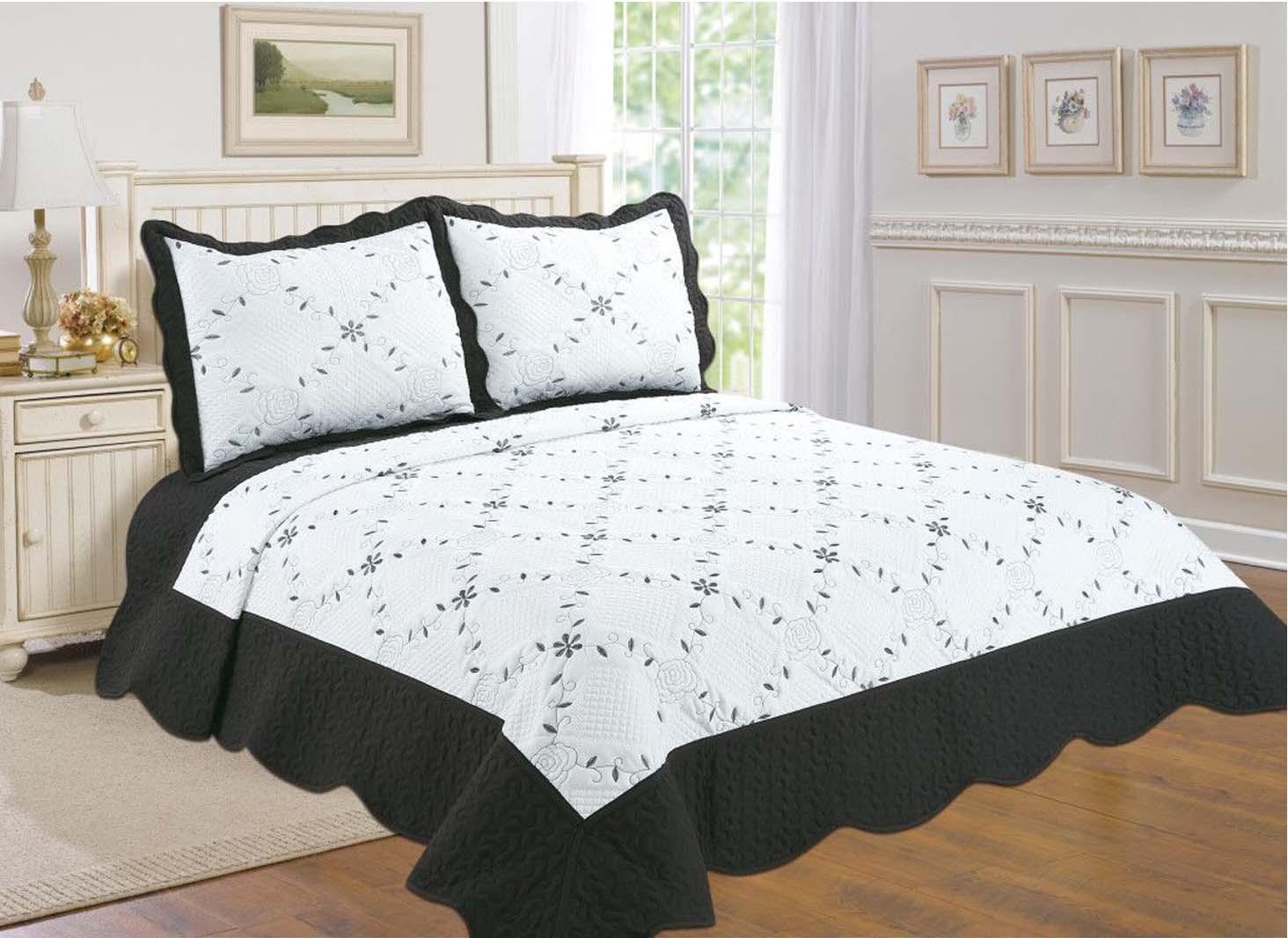 Full/Queen Quilt Set with Charcoal Color bordered embroideries